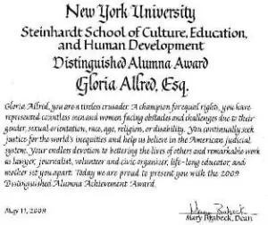 Gloria was the recipient of the Distinguished Alumna Achievement Award from New York University’s Steinhardt School of Culture, Education , and Human Development.This award was presented to her at Steinhardt’s Valedictory Ceremony at Radio City Music Hall on May 11, 2009.